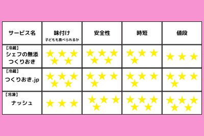 より子ども向けなのは、『シェフの無添つくりおき』と『つくりおき.jp』で、忙しいママをより助けるのは『nosh(ナッシュ)』と言えそうです。